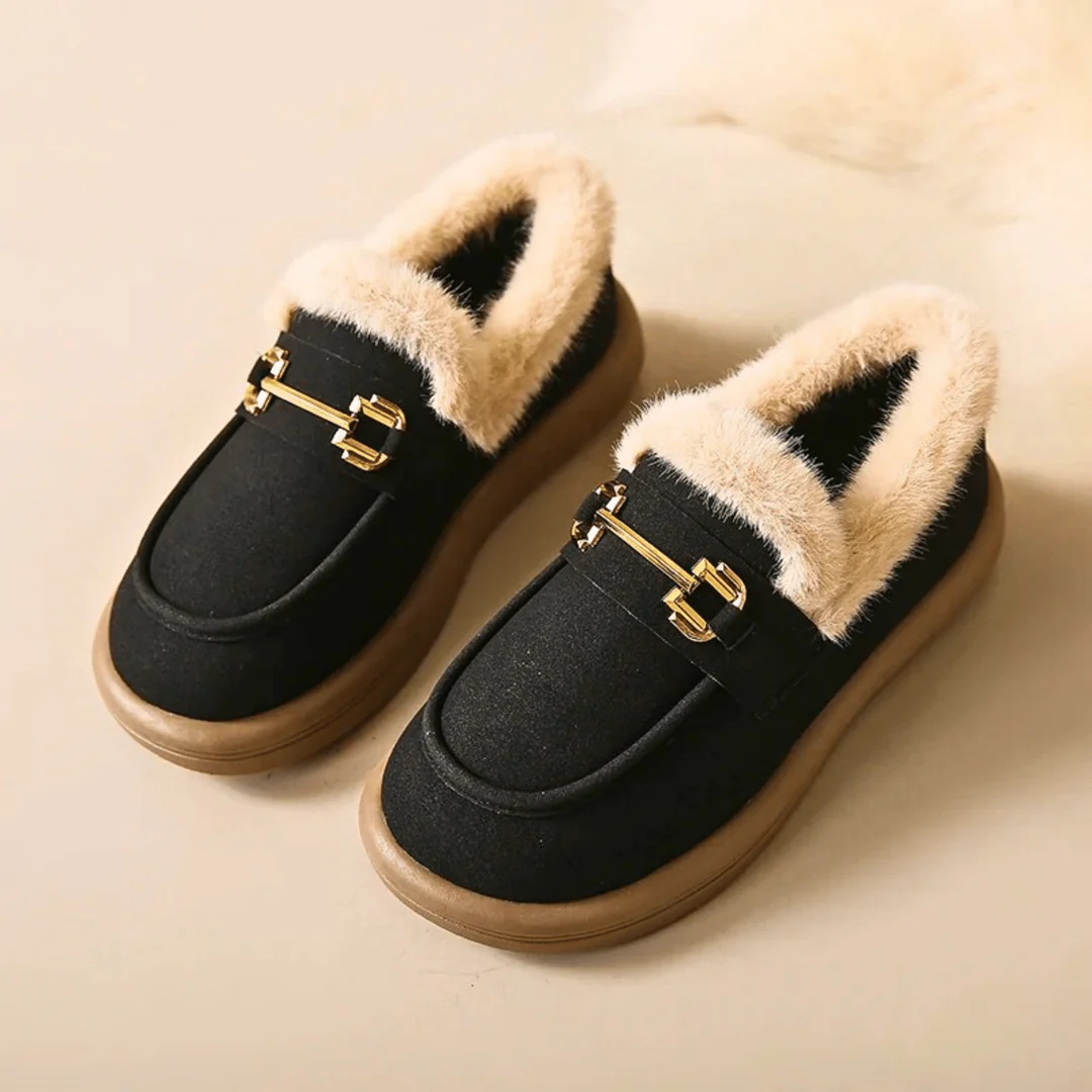 Gefertigt aus weichem Wildleder und mit einem flauschigen Fellfutter ausgestattet, bieten die Serena Loafer umhüllende Wärme und mühelosen Stil. Goldfarbene Details und eine gepolsterte Sohle vollenden das Design und verleihen ein Gefühl von erlesenem Komfort und moderner Winter-Eleganz.